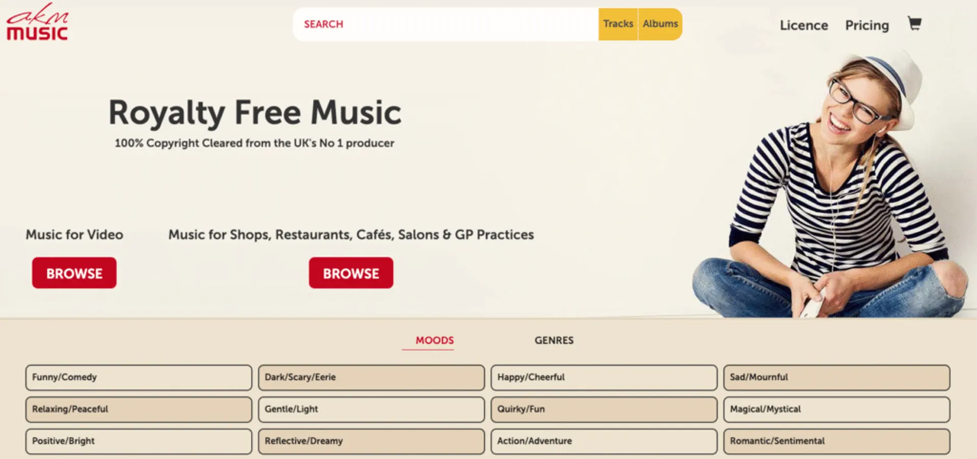 Super direct and easy to navigate — search or browse by mood and genre right from the homepage.
