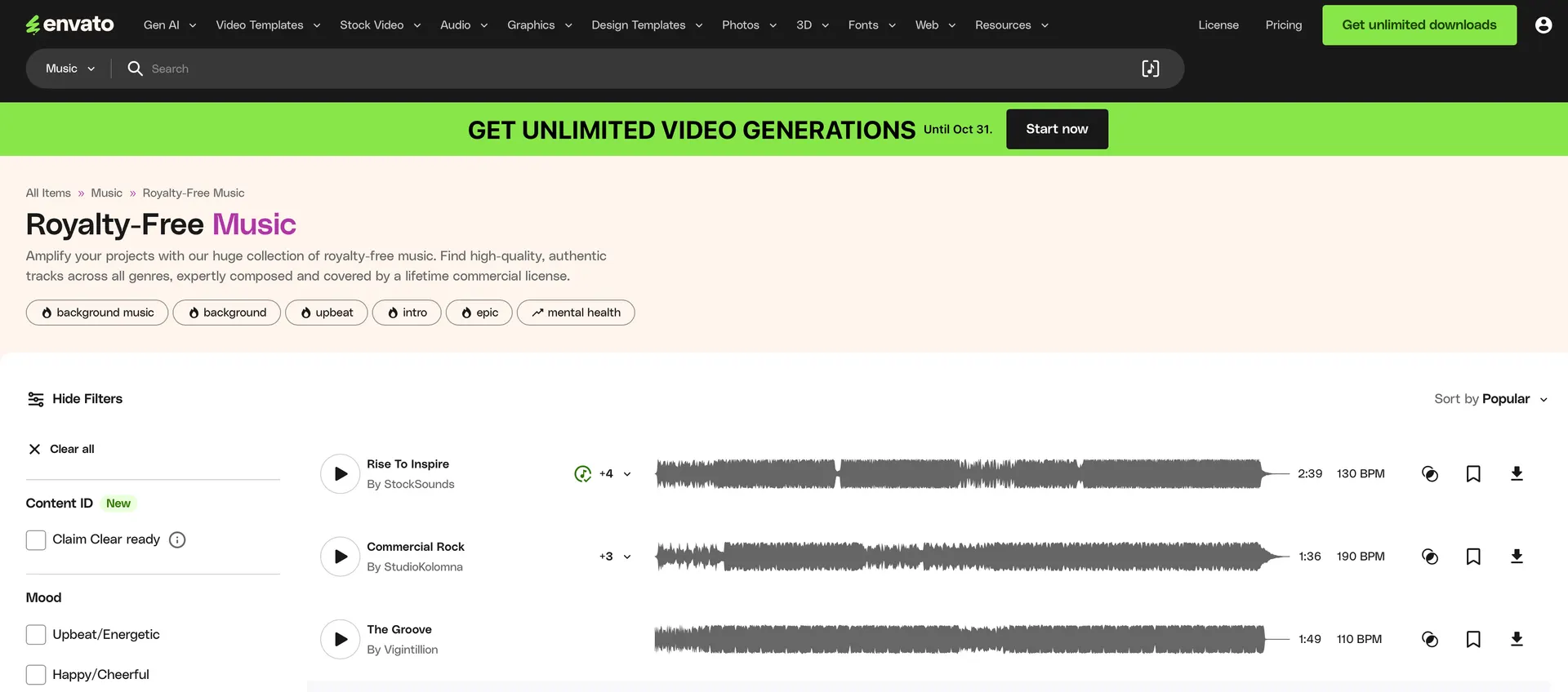Easy filtering by genre, mood, and license type.