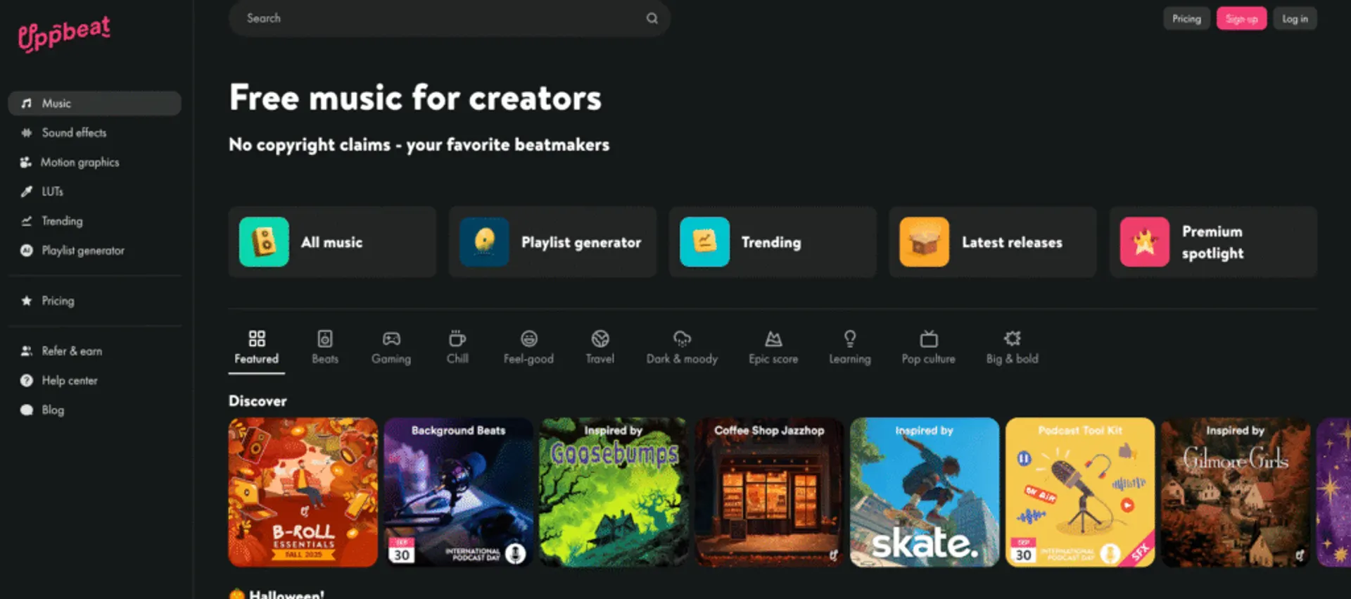 Uppbeat is a freemium royalty-free music platform built for modern creators, offering curated tracks from indie artists with guaranteed no copyright claims.